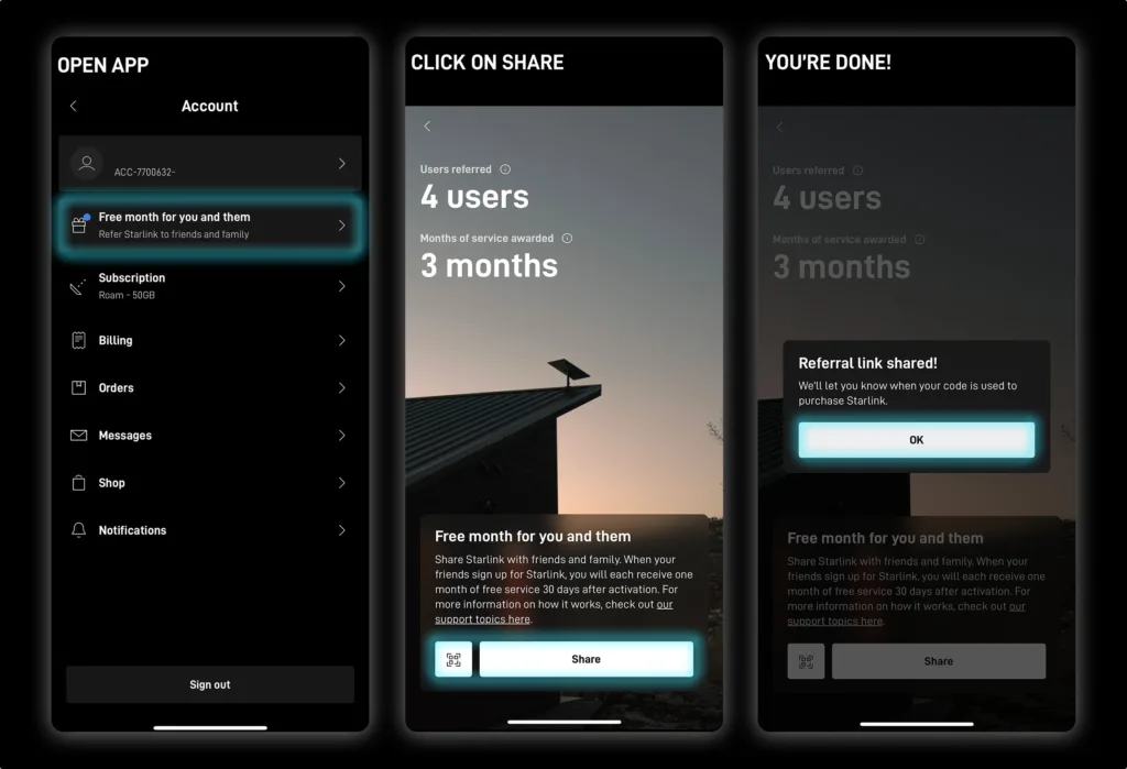 Customers who log into their Starlink account will immediately see the referral feature. On the Starlink app, the option will appear as "Free month for you and them." Starlink offers several methods for sharing referral links with new buyers, including email, text messages, and QR codes. The referee needs to use the provided link to purchase their Starlink dish and service plan from the website, just as they would normally.